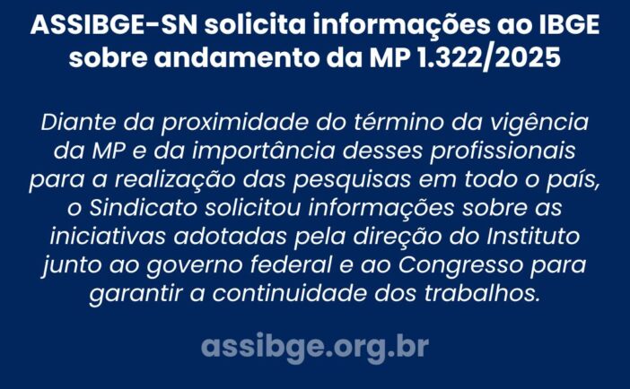 A Executiva Nacional da ASSIBGE-SN encaminhou ofício à presidência do IBGE solicitando esclarecimentos sobre o andamento da Medida Provisória 1.322/2025 no Congresso Nacional e os possíveis efeitos de sua não aprovação para os trabalhos do […]