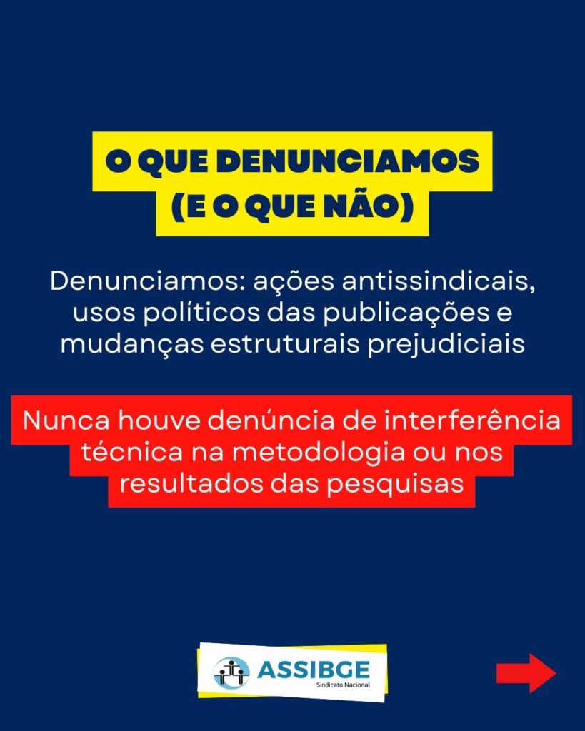 Desde que foram explicitadas divergências entre a atual Direção do IBGE e os servidores do órgão, grupos políticos têm se aproveitado para difundir falsas notícias e criar um ambiente de dúvidas sobre a credibilidade dos dados do Instituto, lançando especulações sobre possíveis interferências políticas nas estatísticas oficiais. As inúmeras manifestações realizadas pela entidade sindical dos servidores, contrárias às ações centralizadoras da atual Direção do órgão, revelam a importância da estabilidade dos servidores e da liberdade sindical. Em momento algum, o sindicato acolheu denúncias de interferências técnicas na metodologia das pesquisas ou em seus resultados. Denunciamos ações antissindicais, exonerações arbitrárias, usos políticos das publicações do órgão e divergências quanto às mudanças realizadas pela atual Direção — como no caso da criação da Fundação IBGE+ e da proposta de mudança no Estatuto do órgão. Essas mudanças, potencialmente, podem interferir na atuação do IBGE, mas seguem sendo combatidas pela luta dos trabalhadores.