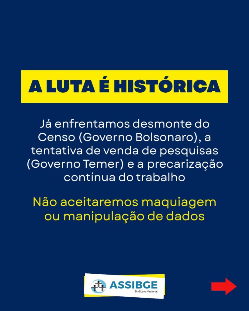 A luta coletiva não é novidade para os trabalhadores do IBGE e para seu sindicato. Lutamos contra o desmonte do Censo Demográfico, realizado no governo Bolsonaro; contra a tentativa de venda de pesquisas, realizada no governo Temer; e não nos calamos diante da precarização intensificada ao longo dos anos 2000. Assim como em outros governos, destacamos que não aceitaríamos qualquer maquiagem, represamento ou manipulação de indicadores para fins propagandísticos ou eleitorais. Portanto, ao contrário do que especulam de forma oportunista diante da crise existente, ressaltamos: os dados produzidos pelo IBGE não perderam sua confiabilidade.