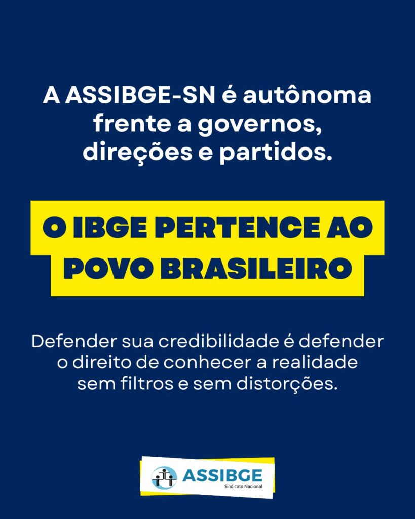 O Sindicato Nacional dos Trabalhadores do IBGE (ASSIBGE-SN) vem a público manifestar seu repúdio à criação de falsas notícias sobre a credibilidade dos dados produzidos pelo IBGE. Em um cenário de constantes disputas narrativas, reiteramos que o rigor técnico do IBGE é assegurado por seu qualificado corpo funcional, formado por aproximadamente 10 mil trabalhadores, envolvidos na coleta, supervisão, coordenação, elaboração e divulgação das pesquisas. A ASSIBGE-SN reafirma que a excelência das estatísticas e geociências produzidas por um dos maiores institutos de pesquisa do mundo, prestes a chegar aos seus 90 anos, é um patrimônio da sociedade brasileira.