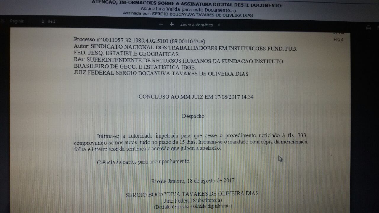 O Juiz federal do Rio de Janeiro, Sérgio Bocayuva, intimou o IBGE a cumprir decisão judicial que assegura aos servidores de Nível Intermediário o direito de acumular a função de professor. O despacho é de 18 de agosto de 2017. A ASSIBGE-SN obteve mandado de segurança a este respeito na década de noventa. Confira cópia da decisão, em anexo.