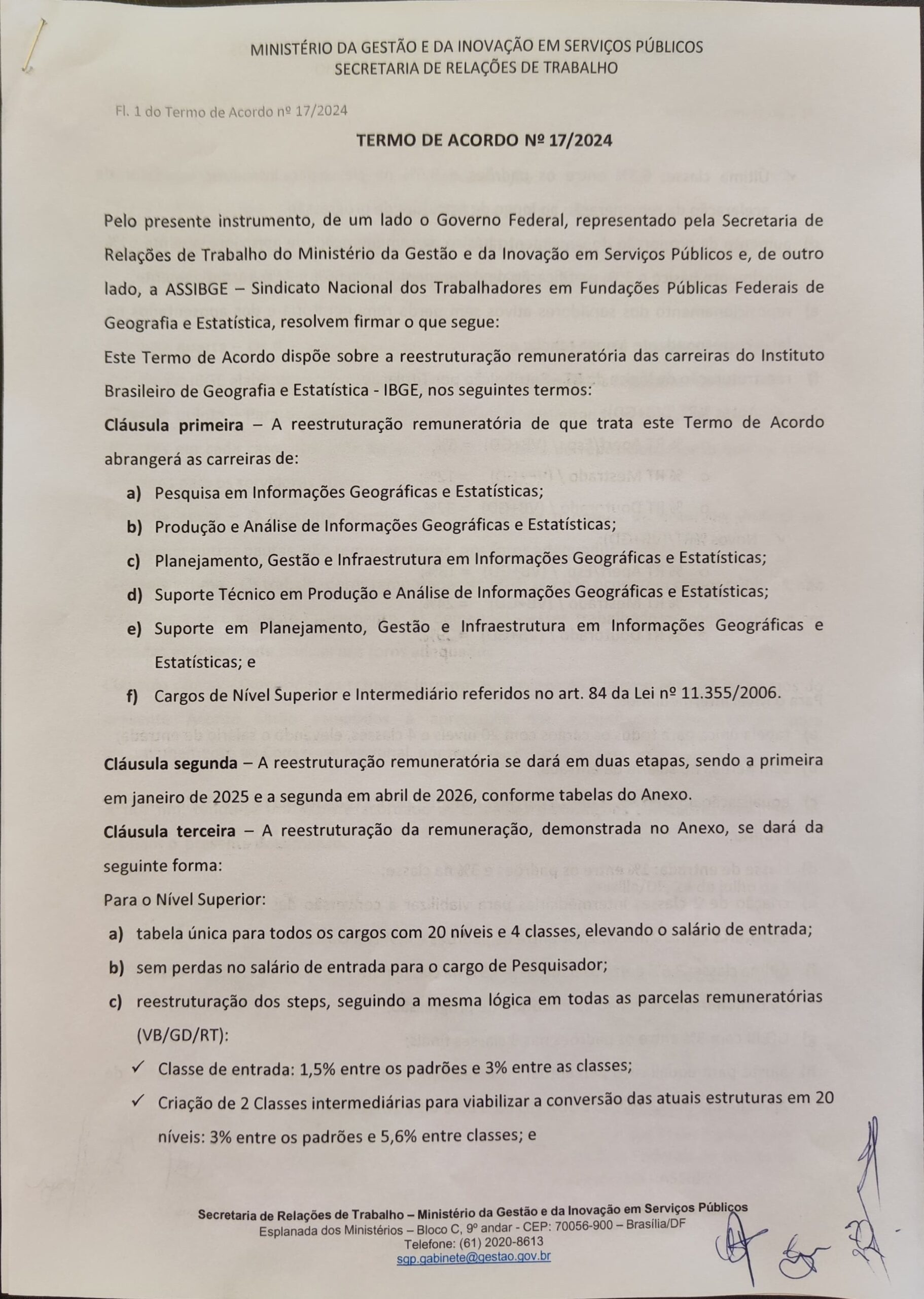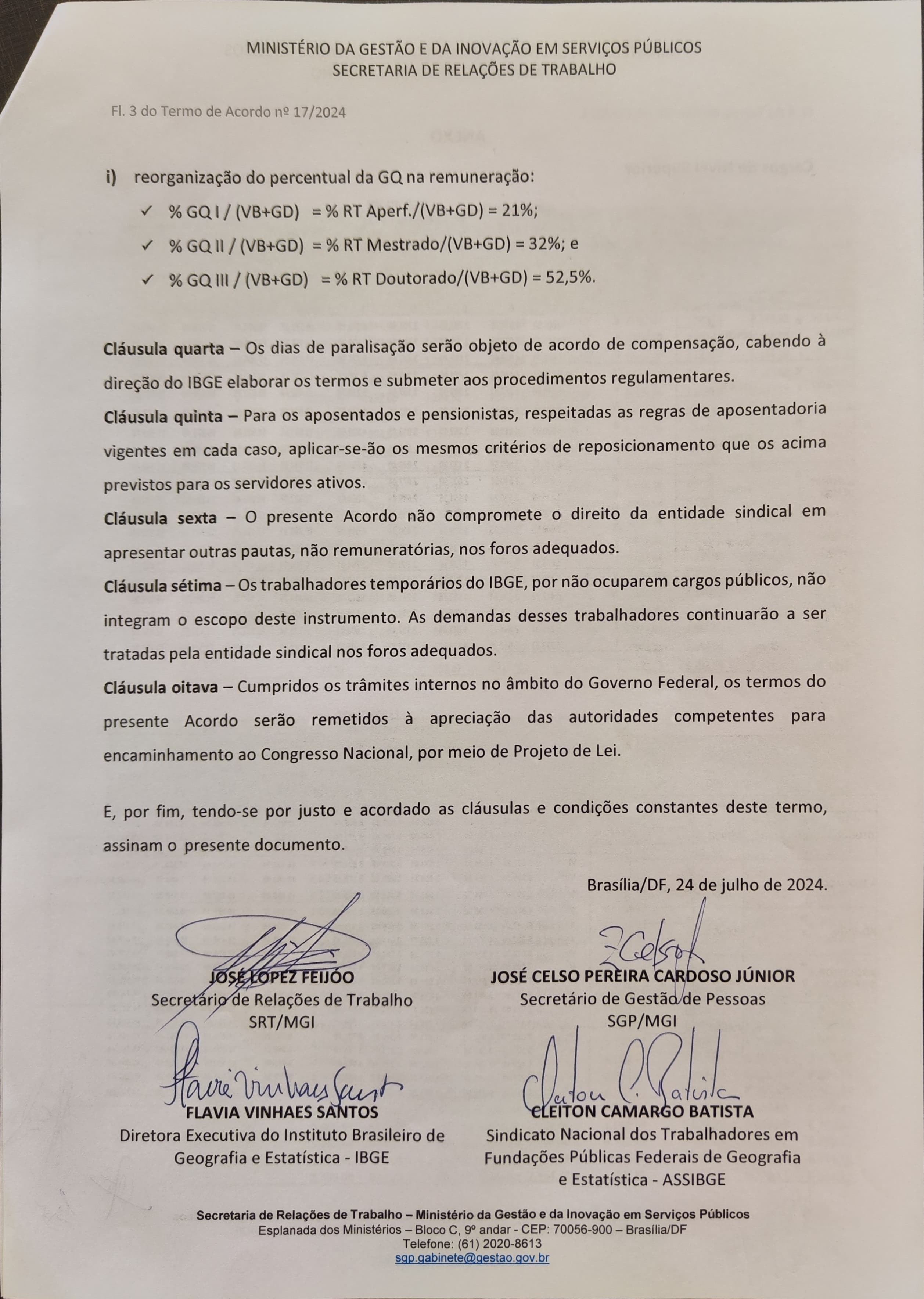 A ASSIBGE assinou hoje, 24 de julho, o acordo referente ao reajuste salarial do biênio 2025/2026 para os servidores efetivos do IBGE. A solicitação para realizar a assinatura foi feita ontem pelo governo, após a ASSIBGE comunicar no dia 22 de julho, que a categoria havia aceitado os termos propostos.
