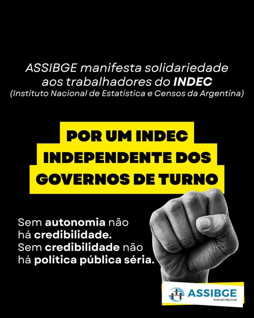 A ASSIBGE-SN manifesta publicamente sua solidariedade aos trabalhadores e às trabalhadoras do INDEC (Instituto Nacional de Estatística e Censos da Argentina), diante dos ataques e das intervenções do governo Milei. Assim como já ocorreu durante os governos Kirchner, os trabalhadores do INDEC vêm se manifestando de forma corajosa em defesa do Instituto e de sua independência, por meio de sua organização sindical, a ATE-INDEC, cuja atuação nos motiva e inspira.