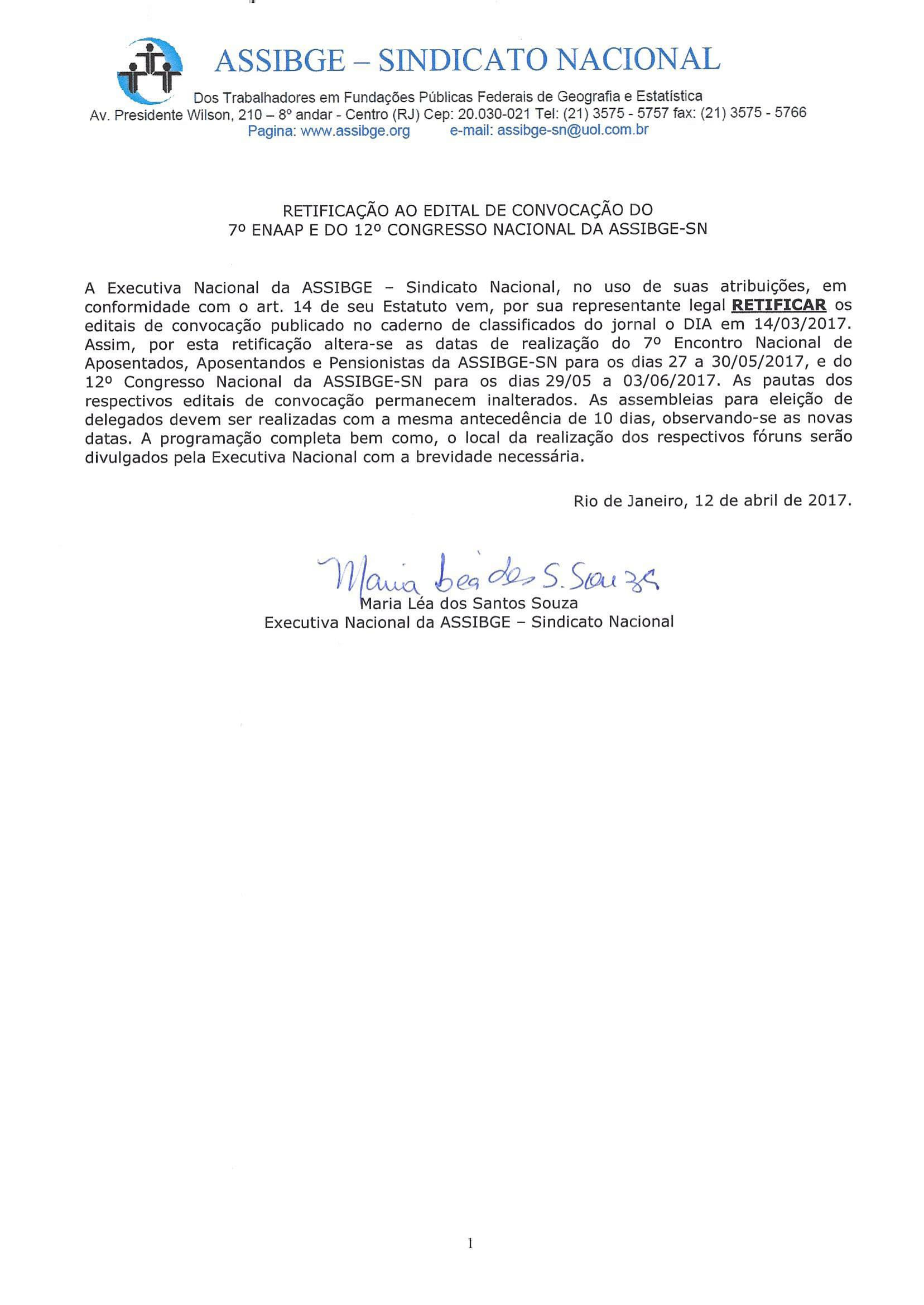 Em função de uma série de dificuldades que fogem à vontade da direção sindical, a Executiva Nacional da ASSIBGE-SN se viu forçada a adiar, por algumas semanas, a realização do 7º Encontro Nacional de Aposentados, Aposentandos e Pensionistas (ENAAP) e o 12º Congresso da ASSIBGE-SN. As pautas de discussão já publicadas permanecem as mesmas e o prazo limite para a convocação e eleição de delegados se mantém em até dez dias antes do Congresso. Lamentamos o acontecido e esperamos contar com a compreensão de todos. Confira, em anexo, o novo Edital de convocação do 7º ENAAP (27 a 30 de maio de 2017) e do 12º Congresso da ASSIBGE-SN (29 de maio a 3 de junho de 2017).