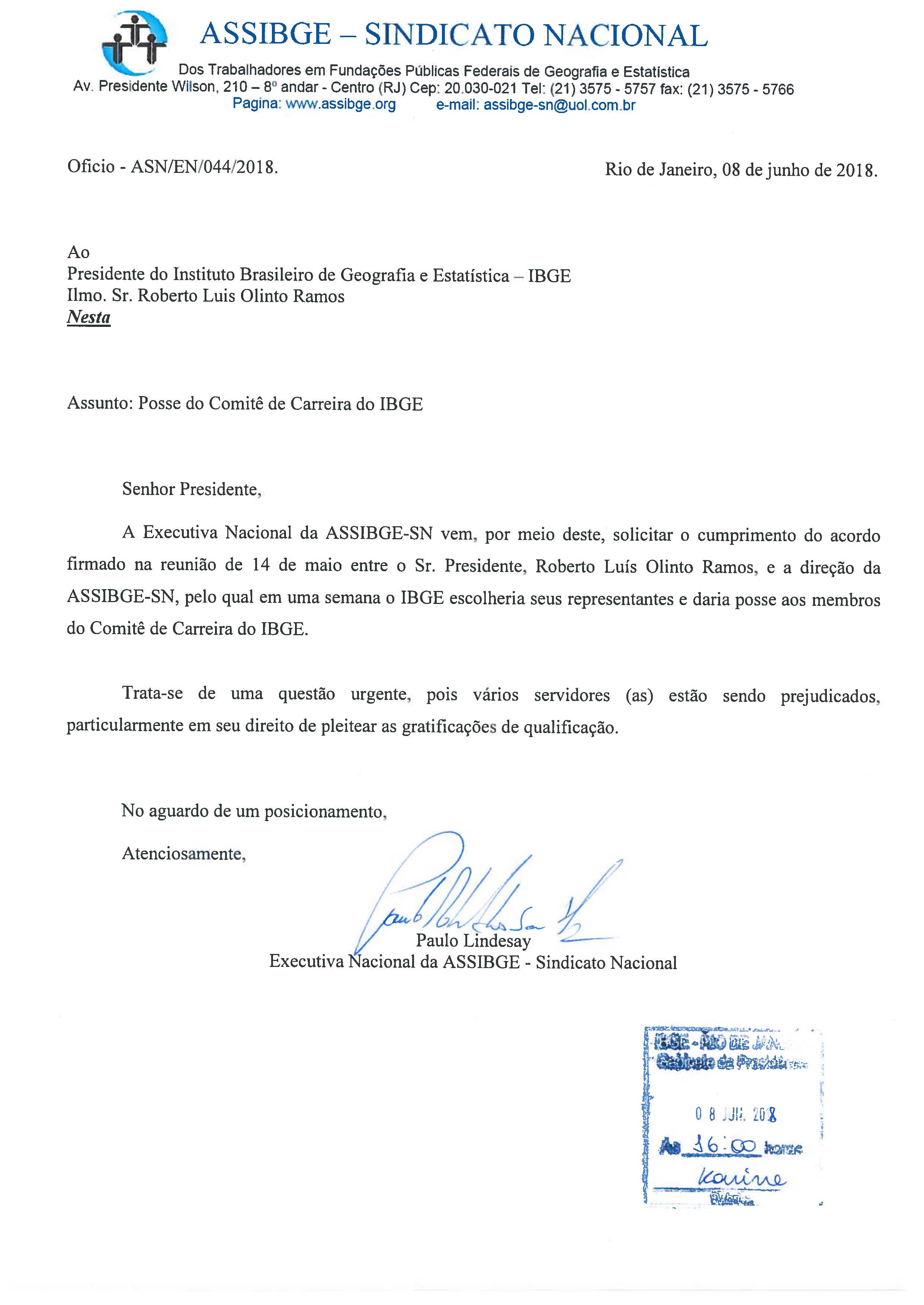 A ASSIBGE-SN enviou ofício (nº 44, de 8 de junho de 2018) ao IBGE, cobrando da Direção do órgão a nomeação dos seus representantes ao Comitê Gestor de Carreira, bem como a posse do CGCPCC. A eleição dos representantes dos trabalhadores ocorreu no final de 2017 e até a presente data não houve nenhuma reunião. Ainda há casos de colegas do IBGE que aguardam decisão sobre seus pedidos de Gratificação de Qualificação, pleito que precisa ser deferido pelo Comitê. Confira a cópia do ofício, em anexo.