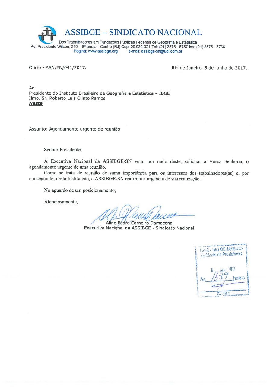 A Executiva Nacional da ASSIBGE-SN enviou ofício à Direção do IBGE, solicitando uma reunião de urgência com o novo Presidente, Roberto Olinto. O objetivo é tratar de assuntos que constam da pauta de reivindicações dos trabalhadores, entregar as resoluções do 12º Congresso do Sindicato e discutir alguns temas emergenciais, como a reforma do Estatuto do IBGE, cuja proposta foi encaminhada por Paulo Rabello de Castro e já se encontra no Ministério do Planejamento para análise. Confira (anexo) a íntegra do ofício enviado ao IBGE, no dia 5 de junho.