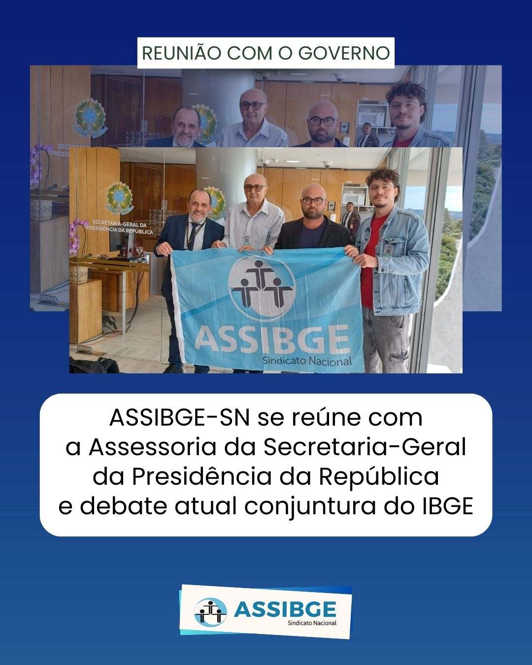 A ASSIBGE-SN reuniu-se com a Assessoria da Secretaria-Geral da Presidência da República para debater a atual conjuntura do IBGE, seus impactos na produção de dados oficiais e os desafios enfrentados pelos trabalhadores do Instituto. Estiveram presentes, pela Executiva Nacional da ASSIBGE-SN, os diretores Diogo Correia, Elvis Vitoriano e Helvécio Amorim, e, pela Secretaria-Geral da Presidência da República, o assessor especial Alexandre Varela.