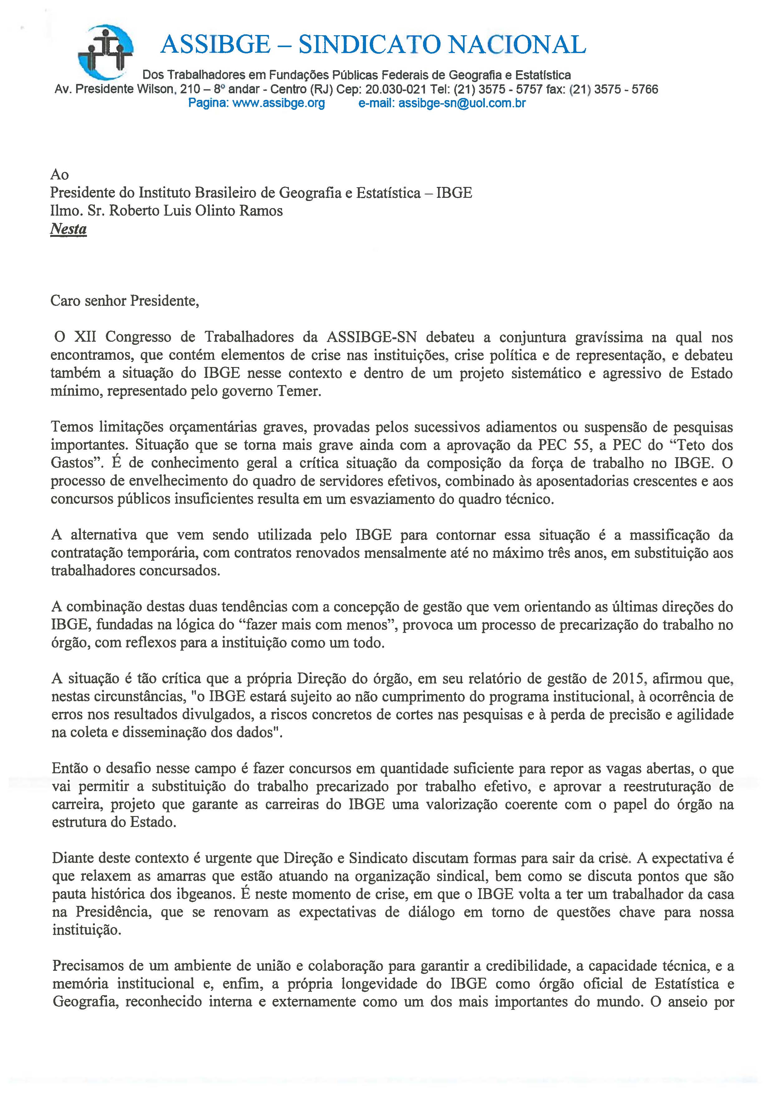 No dia 7 de junho/2017 a Executiva Nacional da ASSIBGE-SN enviou carta ao novo Presidente do IBGE, Roberto Olinto, condenando a política do “fazer mais com menos”, que vem predominando na gestão do IBGE nos últimos anos, e levantando a necessidade de um diálogo entre a Direção e os trabalhadores. Confira a íntegra do documento, abaixo e em anexo.