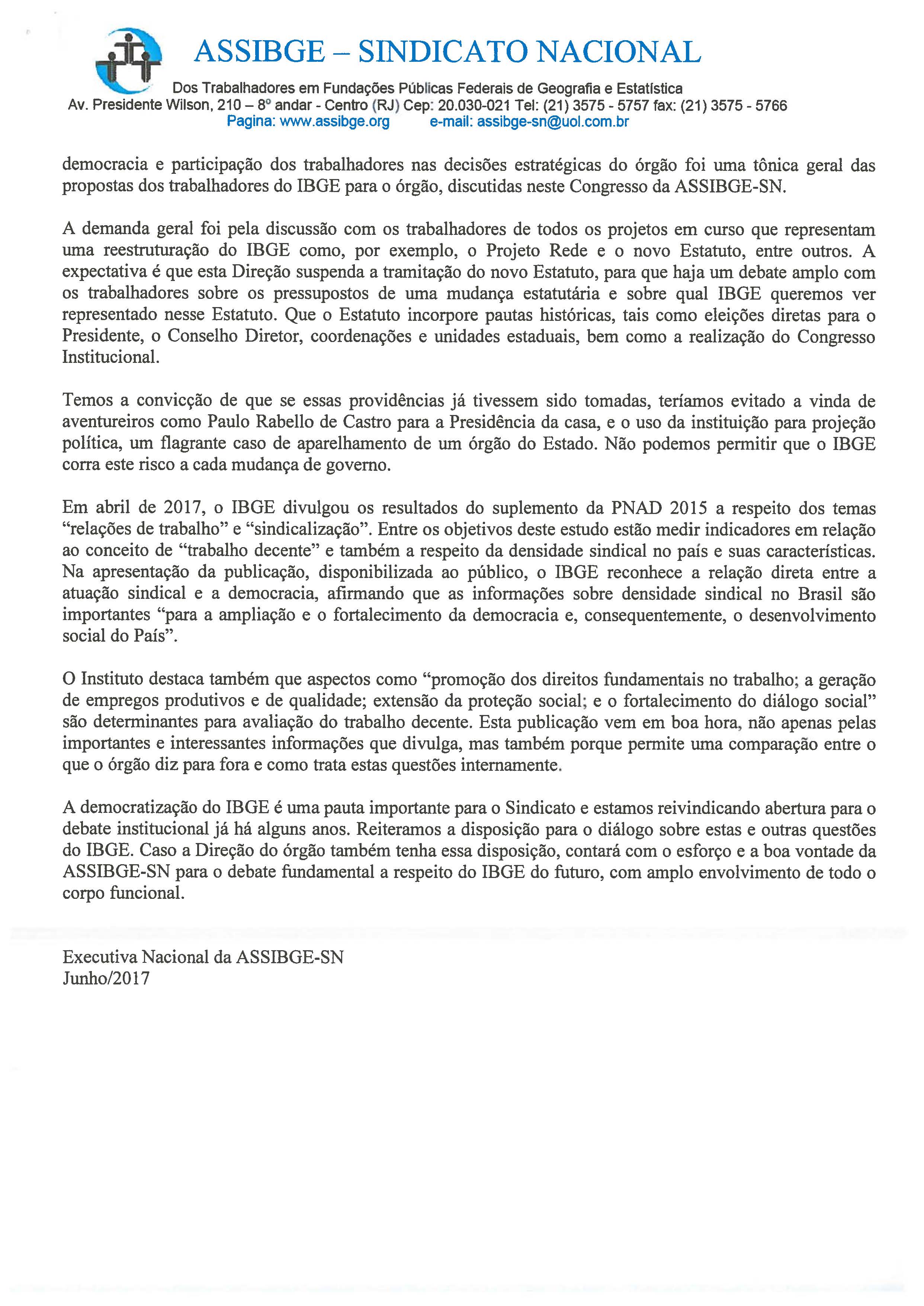 Precisamos de um ambiente de união e colaboração para garantir a credibilidade, a capacidade técnica, e a memória institucional e, enfim, a própria longevidade do IBGE como órgão oficial de Estatística e Geografia, reconhecido interna e externamente como um dos mais importantes do mundo. O anseio por democracia e participação dos trabalhadores nas decisões estratégicas do órgão foi uma tônica geral das propostas dos trabalhadores do IBGE para o órgão, discutidas neste Congresso da ASSIBGE-SN.