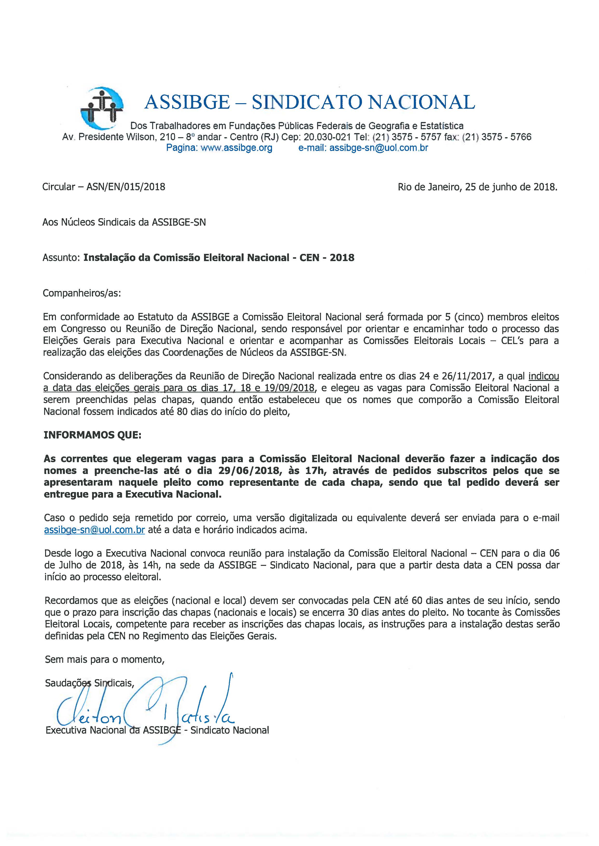 A Executiva Nacional, em conformidade com o que prevê o Estatuto do Sindicato, convoca reunião de instalação da CEN para o dia 6 de julho de 2018, às 14h, na Sede nacional da ASSIBGE-SN. Uma das funções da CEN é orientar e acompanhar a formação e o trabalho das Comissões Eleitorais Locais (CEL), para a realização das eleições para as Coordenações de Núcleos em todos os estados, na mesma data da Executiva Nacional.