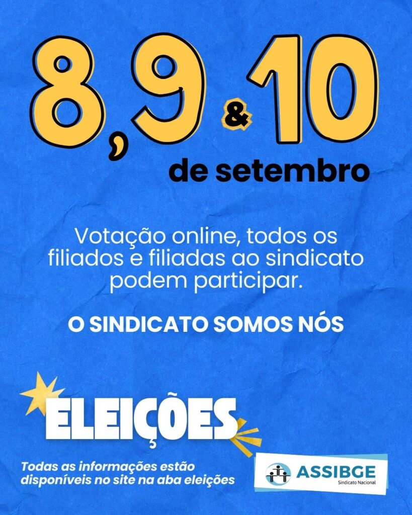 A Executiva Nacional da ASSIBGE-SN orienta todas as Coordenações dos Núcleos Sindicais a intensificarem a divulgação das eleições gerais, de 08 a 10 de setembro de 2025, para ativos, aposentados, temporários e pensionistas. O pleito será digital, através da plataforma Pandora. Participe: sua mobilização fortalece a representatividade, a legitimidade e a democracia do nosso sindicato. Convocamos todos os filiados a votar, escolhendo as novas lideranças das Coordenações dos Núcleos, da Executiva Nacional e os respectivos Conselhos Fiscais.