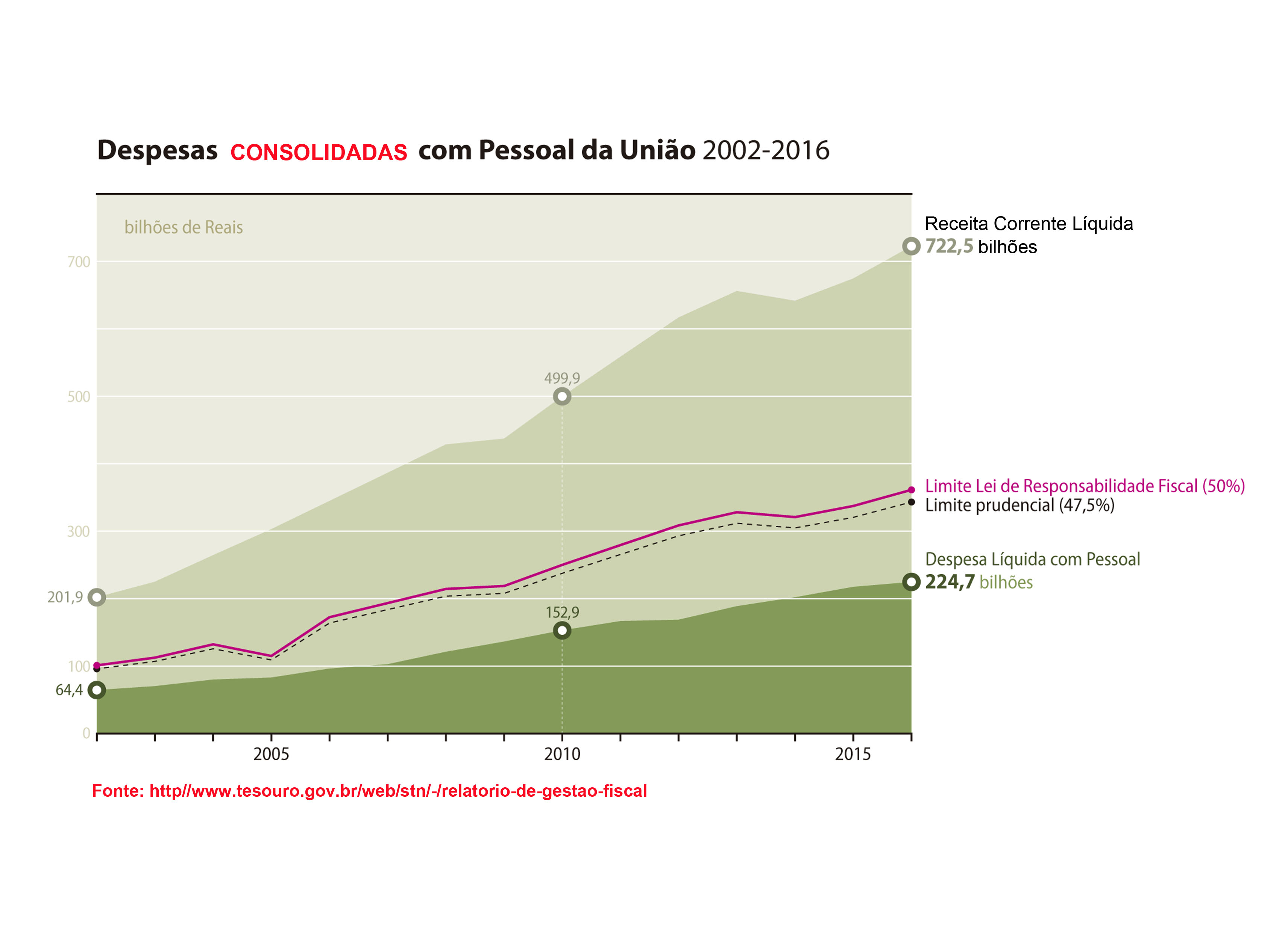 Nesse período os dados oficiais do Tesouro Nacional provam que os gastos consolidados com pessoal da União ficaram entre 26% e 32,32%% da Receita Corrente Líquida. Portanto, bem abaixo do limite legal da LRF para União, que é de 50% da Receita Corrente Líquida (RCL) e o limite prudencial, 47,50% da RCL.