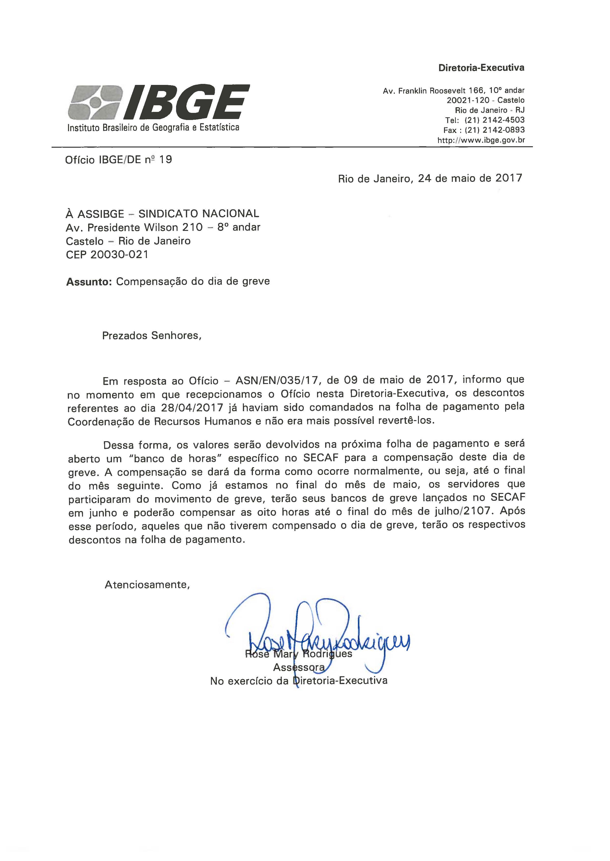 Em resposta ao ofício da ASSIBGE-SN, que solicitou a negociação sobre o dia 28 de abril (Greve Geral), a Direção do IBGE confirmou que o desconto será ressarcido nos salários de maio, pagos em junho. Ao mesmo tempo, será aberto um banco de horas para que as 8 horas sejam compensadas até o final de julho. Confira, em anexo, a íntegra do ofício do IBGE.