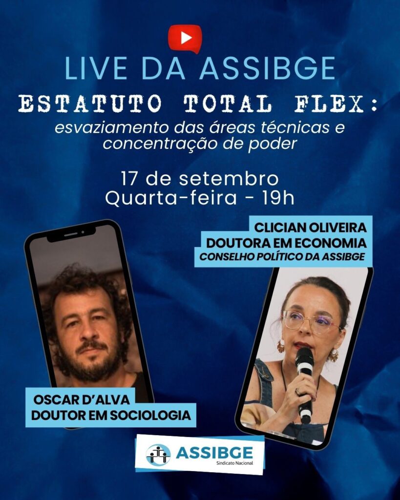 Nesta quarta-feira (17 de setembro), às 19h, a ASSIBGE-SN realizará uma live para debater a proposta de alteração do estatuto do IBGE, divulgada na intranet em 29 de agosto.
