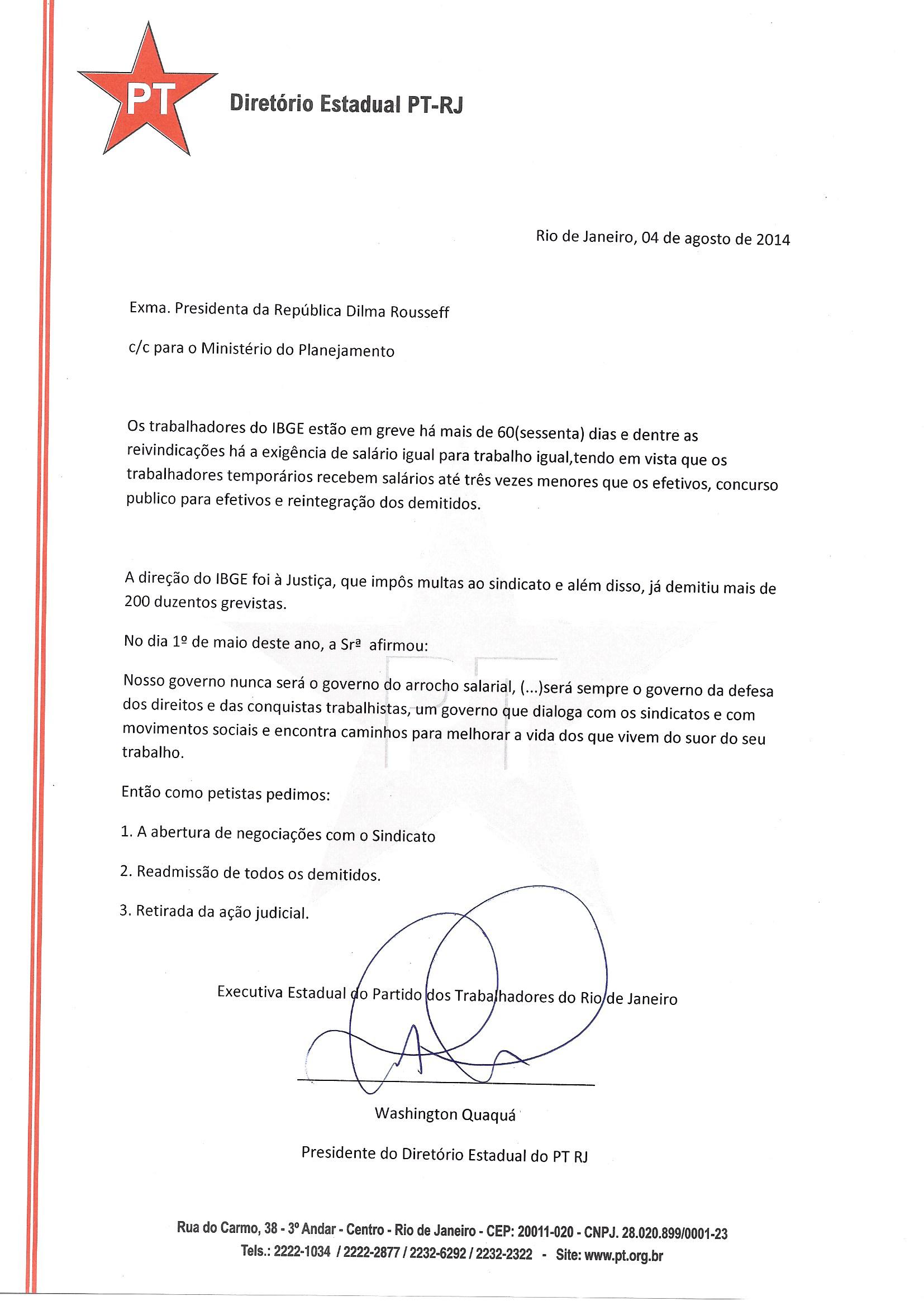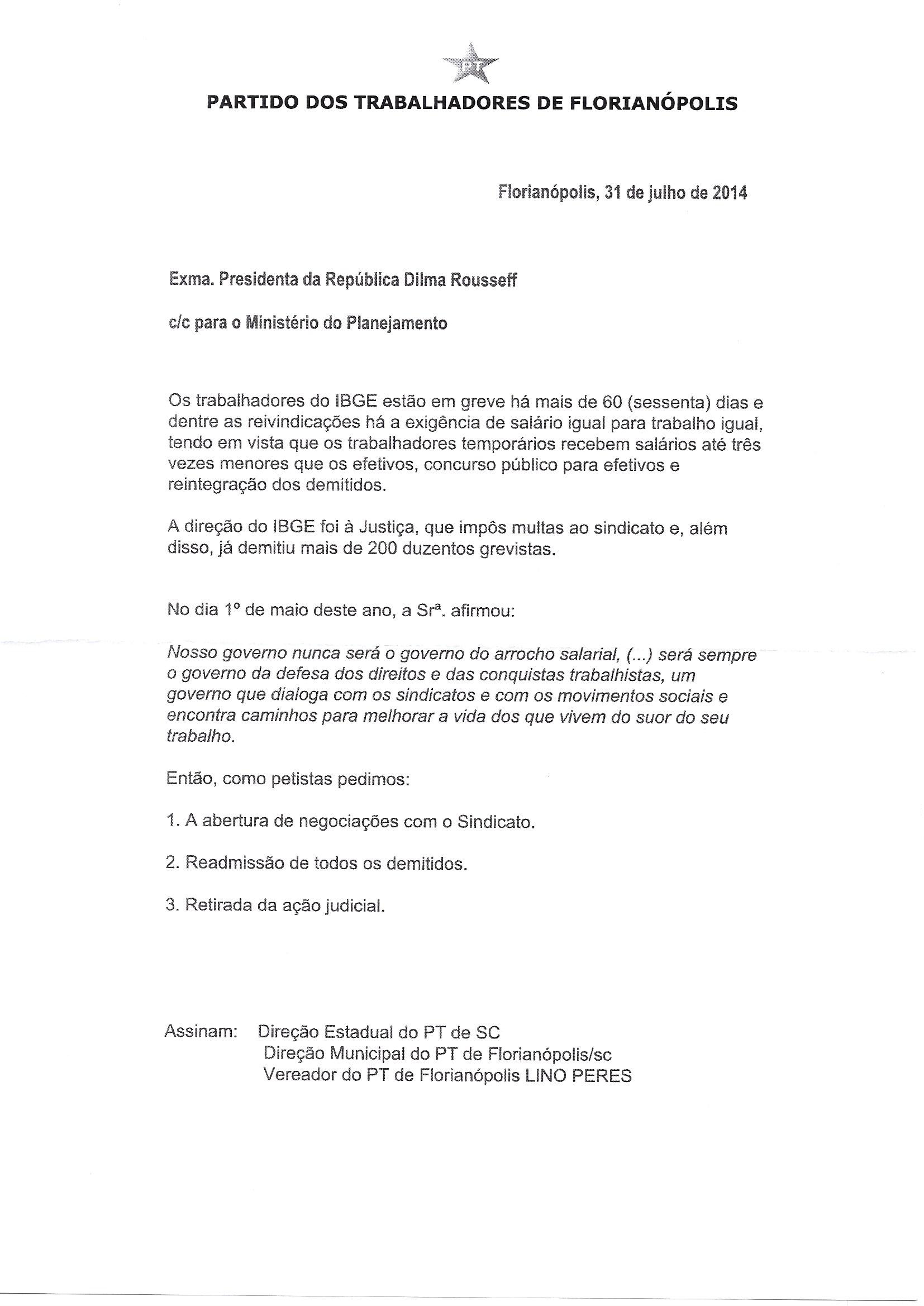 Os diretórios estadual do Rio e municipal de Florianópolis (SC) divulgaram Carta à Presidente da República, Dilma Roussef, pedindo a reabertura das negociações, readmissão dos demitidos e retirada da Ação Judicial que impõe multa à ASSIBGE-SN, em caso de descumprimento de número mínimo de servidores trabalhando durante a greve. Confira (anexos) a íntegra das duas cartas, que têm o mesmo teor.