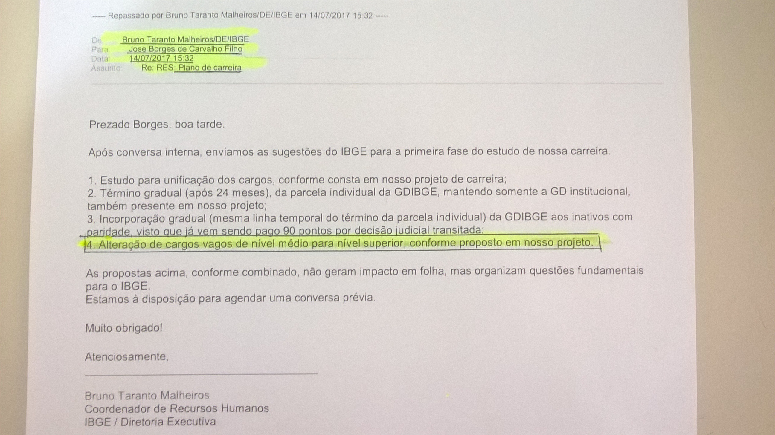 Apesar de afirmar à Executiva Nacional da ASSIBGE-SN que o projeto de reestruturação da Carreira do IBGE estaria paralisado, a Direção do IBGE enviou e-mail ao senhor José Borges de Carvalho Filho, assessor de Augusto Akira Shiba, responsável pela gestão de pessoas do Ministério do Planejamento, no qual pede a “Alteração de cargos vagos de nível médio para nível superior, conforme proposta em nosso projeto”. Confira, em anexo, a íntegra do e-mail.