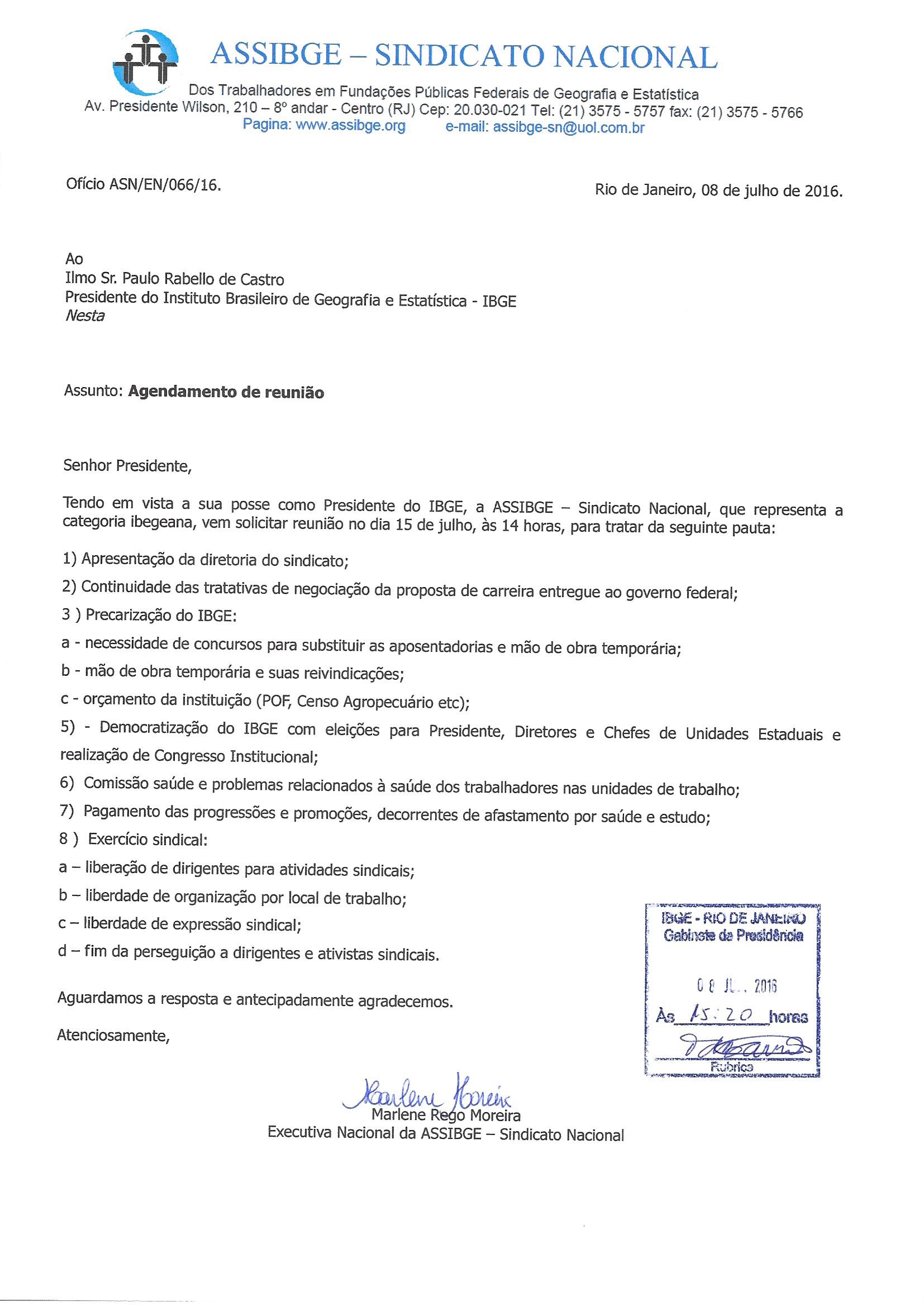 A Executiva Nacional da ASSIBGE-SN enviou ofício (066/16) à Direção do IBGE, no dia 8 de julho, solicitando a marcação de reunião para debater uma série de reivindicações e pontos que ficaram pendentes de reuniões anteriores. Confira a íntegra do documento em anexo: